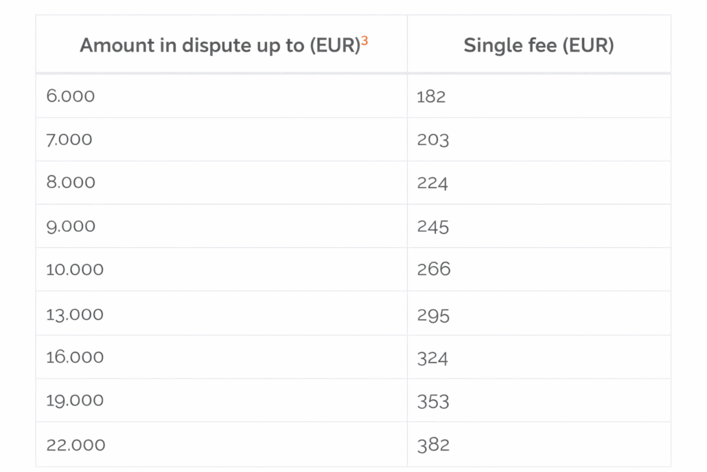 Each party pays its own lawyer in the first instance – even if they win. The fee is based on the same dispute value and includes: